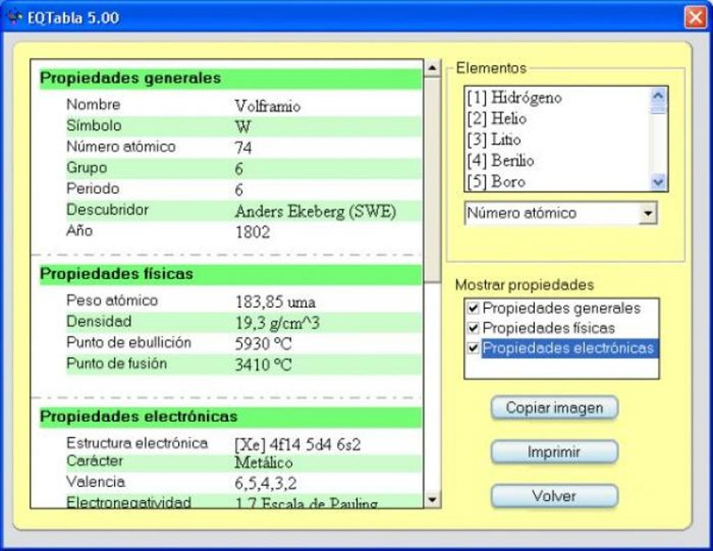 Resulta muy bueno para estudiantes o para ver rápidamente tipos de elementos con características especiales. Sólo elegimos el tipo de filtro y ya lo tendremos delante. Todo está organizado por colores y podremos saber, concretamente, número atómico, símbolo químico, nombre, puntos de ebullición y fusión, densidad, peso atómico, valencia y estructura electrónica. Hasta el momento son 113 los elementos incorporados en EQTabla.